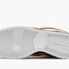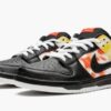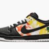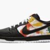 The Nike SB Dunk Low ‘Rayguns – Black’ is a redesigned colorway that brings back the classic SB Dunk that released back in 2005. The black “Rayguns” SB Dunk is part of a ‘home/away’ pack released in December 2019 that reproduces the original black and white colorways, but with a tie-dye treatment across the upper. The 2019 pack is a tribute to the late Sandy Bodecker, the Nike executive responsible for the rise of Nike SB in the early 2000s. Bodecker often wore a tie-dye Rayguns hoodie, which is the inspiration for the bringback of the “Rayguns” Dunks in his honor. This colorway features a black premium leather base with orange and yellow tie-dye accents. A green embroidered Raygun character can be found on the lower portion of the upper near the midsole. The Nike SB Dunk Low ‘Rayguns 2019 – Black’ was released on December 27, 2019.