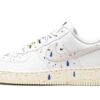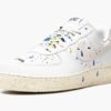 The Nike Air Force 1 Low ‘Paint Splatter’ is one of two colorways of the retro basketball and lifestyle shoe to feature an array of colorful paint splatters on their design. The multicolor, dripping paint splatters found throughout the shoe’s upper mimic the look of a shoe that appears as if it were worn on the feet of an artist during a studio session. Dashes of blue, red, yellow, and black paint drips can be found on the white leather base, including on the perforated toe and mid-panel and on the Sail leather Swoosh on both sides. Additional paint details highlight the look of the laces layered over the white nylon tongue. Nike goes as far as to construct its signature ‘Nike’ logo in a paint splatter design on the white nylon tongue tag. Additional paint graphics appear on the heel tab around the black ‘Nike Air’ insignia. The Sail rubber midsole features speckle detailing as a continuation of the model’s ‘Paint Splatter’ theme.