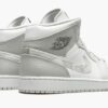 The Air Jordan 1 Mid ‘White Camo’ features a neutral aesthetic that can be worn with virtually anything in your wardrobe. Appearing in the alternate mid-top version of Michael Jordan’s first signature shoe, the ‘White Camo’s’ upper displays tumbled leather overlays in grey. Smooth white leather can be found on the mid-panel, perforated toe, and collar. A subtle white and grey camouflage Swoosh dots either side of the shoe. Additional branding appears in the form of a black ‘Wings’ logo on the collar, and black Jumpman insignia on the white nylon tongue tab.