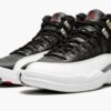 The Air Jordan 12 ‘Playoffs 2022’ is a February 2022 release of an original colorway of the retro basketball shoe that was worn by Michael Jordan during the 1997 NBA Playoffs. An All-Star Weekend 2022 release, the Jordan 12 ‘Playoffs’ celebrates the shoe’s 25-year anniversary in spectacular fashion as the modern incarnation of the shoe is a one-to-one remake of the original version from ’97. The shoe features a black leather upper with contrasting Metallic Silver eyelets. Textured white leather is found on the toe, mudguard, and midsole. A silver ‘Jumpman’ plate appears on the branding plate on the lateral side of the shoe. The black leather tongue displays a red embroidered Jumpman and ‘Two3′ branding. Red ’23’ and ‘Jordan’ branding can be found on the back of the black rubber midsole and heel, respectively. Overall, the February 2022 release of the Air Jordan 12 ‘Playoffs’ is consistent with the original version from 1997. Release date: February 19, 2022