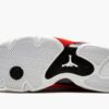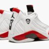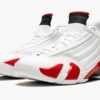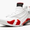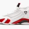 The Air Jordan 14 ‘Varsity Red,’ also known as ‘Candy Cane,’ is the 2019 retro of the iconic colorway of Michael Jordan’s fourteenth signature shoe. The Jordan 14 is featured in its original white and Varsity Red color combination with black accents, which first released in 1998. It is constructed in full-grain leather with ribbed and perforated areas on the quarter panel and heel. The Ferrari-inspired design of the Jordan 14 is completed with Zoom Air cushioning and a large carbon fiber support shank within the midsole. The Air Jordan 14 ‘Varsity Red’ released on April 6, 2019.