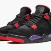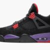 In 2018 Jordan Brand took the original black, purple, and red palette from the Air Jordan 7 and used it to create the Air Jordan 4 “Raptors.” The fierce colorway was rumored to be designed by Drake, drawing inspiration from his beloved Toronto Raptors. The Air Jordan 4 “Raptors” has a premium black suede construction with a purple speckled midsole and bright red accents.