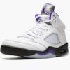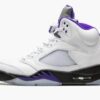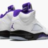 The Air Jordan 5 “Concord” is an August 2022 release of Michael Jordan’s fifth signature shoe in a colorway inspired by the beloved Air Jordan 11. The “Concord” theme was introduced on the Jordan 11 back in 1996, and is one of the most popular colorways in sneaker history. Here, on the Jordan 5, the “Concord” features the same color block as the model’s classic “Fire Red” colorway, albeit with purple accents instead of red detailing per the original version. The upper is constructed from white leather. Translucent mesh is found on the mid-panel and lower tongue. A purple or Concord-colored Jumpman is embroidered on the heel. Additional Concord accenting can be found on the Jumpman on the reflective Metallic Silver tongue, on the collar, on the underside of the tongue, and on the shark tooth detailing on the black painted midsole. Release date: August 13, 2022
