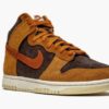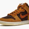 The Nike Dunk High ‘Dark Curry’ puts an appealing lifestyle look on the timeless high-top shoe. The ‘Dark Curry’ was released in March 2021 and exemplifies Nike’s efforts of expanding the Dunk’s footprint in sneakers. A year earlier, in 2020, the Nike Dunk re-emerged from relative obscurity to once again capture the attention of sneaker collectors due to an impressive amount of limited edition collaborations and returning retro colorways. As for the design of the ‘Dark Curry,’ hairy orange-brown suede overlays on the model’s forefoot, eyelets, collar, and heel contrast the black brushed suede base. A darker shade of brown suede can be found on the Swoosh branding on either side and on the small pull tab on the heel. Nike layers brown laces over the black mesh tongue and adds a midsole for a timeless look. Underfoot, a tan outsole finishes off the look of the ‘Dark Curry.’ Release date: March 5, 2021.
