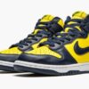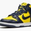 The Nike Dunk High ‘Michigan 2020’ is the 2020 retro of the original Dunk colorway worn by the Michigan Wolverines basketball team in 1985. Appearing in the original ‘Be True to Your School Pack,’ the ‘Michigan’ look is one of the most sought after Dunk colorways. The upper features a two-tone Varsity Maize and Midnight Navy leather color block. Navy blue leather panels appear on the forefoot, eyelets, collar, and heel. Contrasting yellow leather dots the perforated toe, mid-panel, collar, and heel, and provides a stark contrast against the dark overlays. Midnight Navy Swoosh detailing is located on either side of the high-top shoe. Additional style elements include blue laces, a yellow nylon tongue tab with blue Nike branding, and a classic white and blue sole. Release date: September 26, 2020.