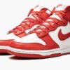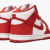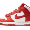 The Nike Dunk High ‘University Red’ is an original colorway of the vintage basketball shoe from the ‘Be True to Your School’ pack from 1985. The ‘University Red,’ or as it’s more commonly known as, the ‘St. John’s’ colorway, was released in March 2022 and is a remake of the shoe worn by members of the St. John’s Red Storm college basketball team in the mid-80s. The shoe features a white leather base with University Red leather overlays on the forefoot, eyelets, and heel. A contrasting red leather Swoosh is located on the mid-panel, and white Nike embroidery detailing can be found on the heel. A white rubber midsole with a bold red outsole completes the look of this nostalgic design. Release date: March 1, 2022