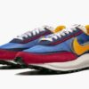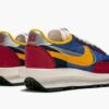 The sacai x Nike LDWaffle Trainer ‘Varsity Blue/Varsity Red’ is a unique collaboration by the Japanese high-fashion label and Nike. The first-of-its-kind design is a hybrid model that layers two vintage Nike running shoes on top of each other, the LDV and the Waffle Racer. With a mesh base, the upper features double suede panels, double Swooshes, double tongues, and optional double laces. The foam midsole follows the same concept, stacking two sole units on top of one another. This colorway features the Waffle Racer elements in Varsity Blue and silver, and the LDV panels in Varsity Red and yellow Del Sol. The limited edition sacai x Nike LDWaffle Trainer ‘Varsity Blue/Varsity Red’ released in spring 2019.