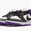 The Nike SB Dunk Low ‘Court Purple’ is a skate shoe with a colorway inspired by an Air Jordan 1 of the same nickname. Nike SB released the ‘Court Purple’ as part of its Spring 2021 collection. The design is one of several SB Dunks to reference popular Air Jordan 1 colorways over the years, joining the ‘J-Pack’ and ‘Space Jam,’ among others, to make the Jordan-to-SB Dunk jump. Details include buttery black leather overlays on the forefoot, eyelets, collar, and heel that contrast the white leather base. A black leather Swoosh appears on the mid-panel and Court Purple leather can be found on the heel. Black ‘Nike’ embroidery marks the back of the shoe. The SB Dunk’s signature puffy tongue design appears on the ‘Court Purple’ and provides the wearer with a cushioned ride for skateboarding. Additionally, the design of the outsole offers plenty in the way of grip for those who opt to skate the “Court Purple” SB Dunk Low.