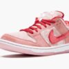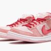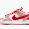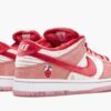 The StrangeLove Skateboards x Nike SB Dunk Low is a special colorway designed in collaboration with the underground skate brand to celebrate Valentine’s Day. Holidays have traditionally served as a source of inspiration for Nike SB and their venerable Dunk dating back to the mid-aughts heyday of the shoe. That tradition continues with this premium Dunk Low. Heartwarming hues of pink and red encompass the upper of the low-top Dunk, which include a red velvet Swoosh and light pink velvet overlays on the forefoot and heel. StrangeLove’s logo is embroidered onto the heel, and it also appears on the white nylon tongue tab. A white midsole and translucent pink outsole with red and blue hearts visible underneath completes the unique design.