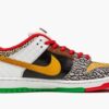 The Nike SB Dunk Low ‘What the P-Rod’ is a special makeup of the classic skate shoe celebrating pro skater Paul Rodriguez’s decades-long partnership with Nike SB. In classic ‘What the’ form, the Nike SB Dunk Low ‘What the P-Rod’ culls design inspiration from various popular colorways of P-Rod’s Nike SB Dunk collaborations. Colorways such as the ‘Mexican Blanket’ and the Air Jordan-inspired ‘J Rod’ are just some of the looks displayed on the design. Specifically, the right shoe features the boxing-inspired gold lace dubrae of Rodriguez’s ‘Mexican Boxing’ SB Dunk High from 2020. Covetable ‘P-Rod’ Nike SB Dunk colorways are displayed underneath the shoe on the outsole. Mismatched quilted liners, Swooshes, tongues, laces, overlays, midsoles, and outsoles make the ‘What the P-Rod’ one of the most head-turning Nike SB Dunk releases of all-time. Release date: May 24, 2021.